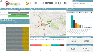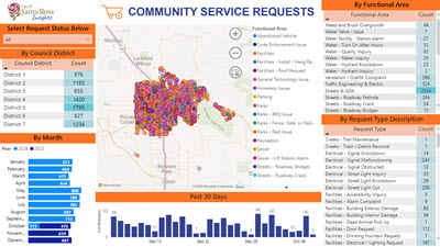 COMMUNITY SERVICE REQUESTS Discover trends and details in community service requests across Santa Rosa with our intuitive dashboard. This tool details requests ranging from code enforcement issues to streetlight repairs, pothole maintenance, and much more. The interactive GIS map enhances transparency and helps residents and city officials stay informed about local service dynamics.