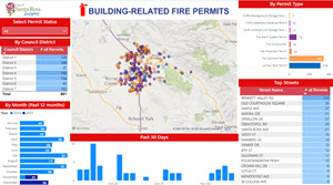 BUILDING-RELATED FIRE PERMITS This dashboard offers a map view and detailed information on building-related fire permits issued throughout the city over the past 12 months. Tailor your exploration by filtering for specific permit types or statuses. You can also refine the data by Council District, month, or streets with the most permit activity. For an in-depth look, hover your mouse over any map point to see a pop-up with additional information.