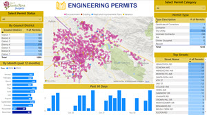 ENGINEERING PERMITS This dashboard offers a map view and detailed information on engineering permits issued throughout the city over the past 12 months. Tailor your exploration by filtering for specific permit types or statuses. You can also refine the data by Council District, month, or streets with the most permit activity. For an in-depth look, hover your mouse over any map point to see a pop-up with additional information.