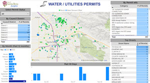 WATER UTILITY PERMITS This dashboard provides information and a map view of Water / Utilities Permits opened throughout the City over the past 12 months. You may filter down on specific statuses or by permit information to focus only on those permits. You may also click to filter by Council Districts, by month, or by streets with the most activity. You may also hover your mouse over a specific point on the map to see a pop up containing more information.