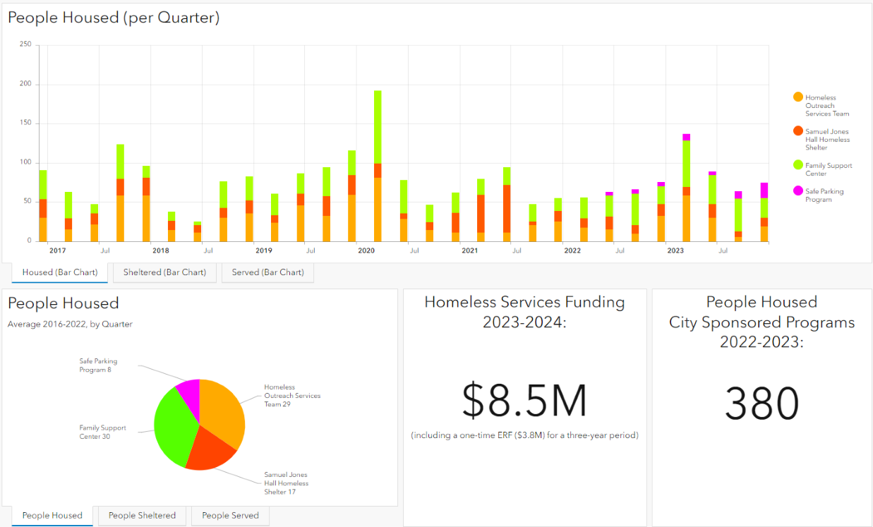 HOMELESS SERVICES DASHBOARD This dashboard shows the number of people served, sheltered, and/or housed through the following City of Santa Rosa-funded homeless services programs: Safe Parking Program (SPP), Homeless Outreach Services Team (HOST), Samuel L. Jones Hall Homeless Shelter (SJH), Caritas Family Center, and Caritas Drop-In Center. Sheltered data for HOST and Caritas Drop-In Center represent individuals referred to shelter through these programs, and data for SPP, SJH, and Caritas Family Center represent individuals sheltered directly through these programs. Housed data for SPP, HOST, SJH, and Caritas Family Center represent individuals placed into housing through these programs. Santa Rosa’s budget for homeless services programming provides funding for emergency shelters for single adults and families, the safe parking program, day services, the warming center, street outreach, and housing assistance in alignment with the Homelessness Solutions Strategic Plan and regional efforts to end homelessness through the Sonoma County Homelessness Coalition. For more information please see Santa Rosa's Homelessness Solutions webpage.