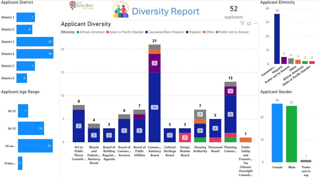 BOARDS & COMMISSIONS DIVERSITY REPORT These visualizations highlight efforts and opportunities to enhance the diversity of applicants and appointments to The City of Santa Rosa's Boards & Commissions and to supplement the annual report mandated by section 11 of the city's charter.